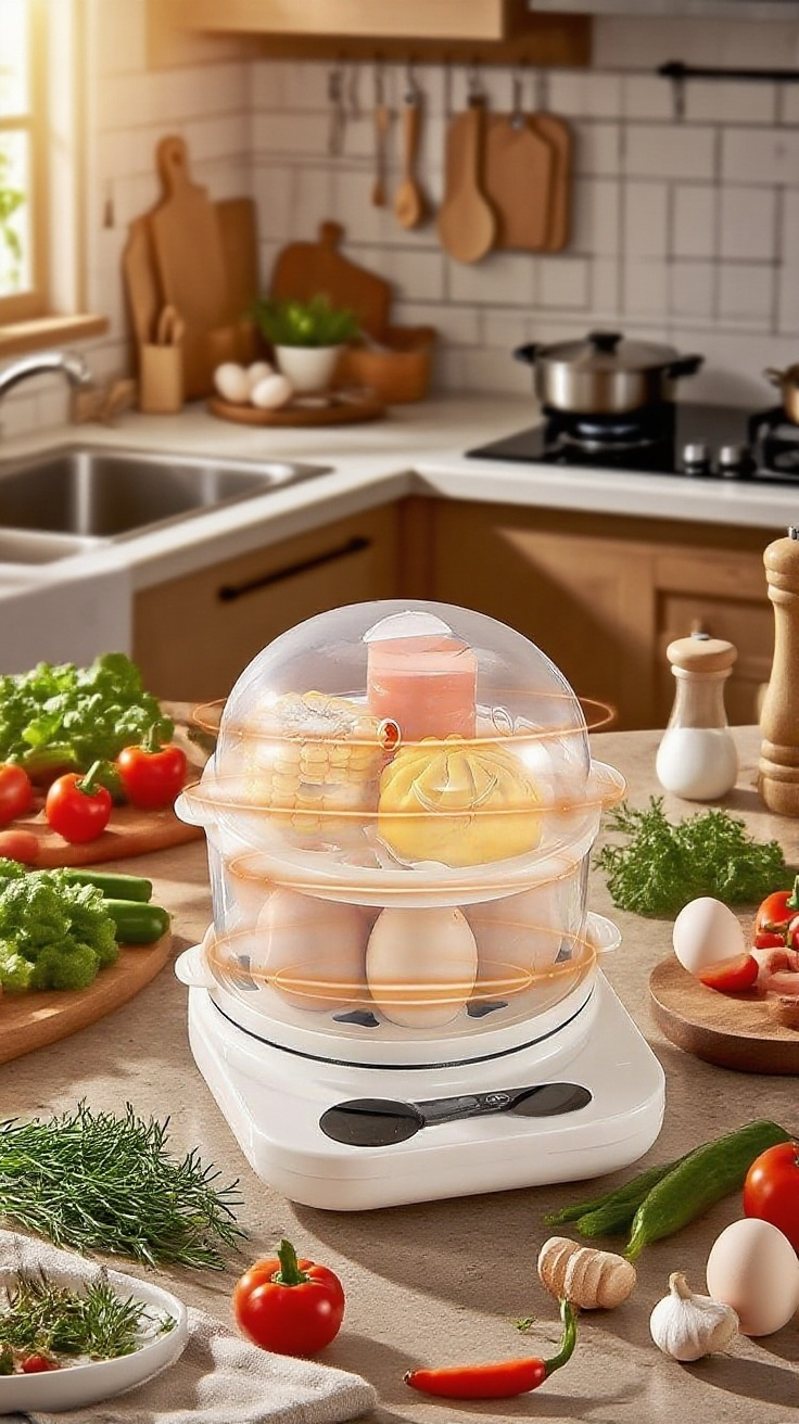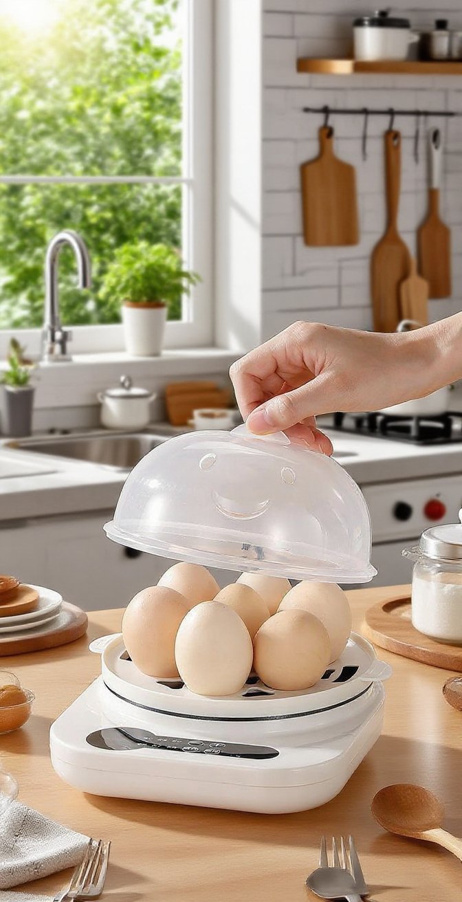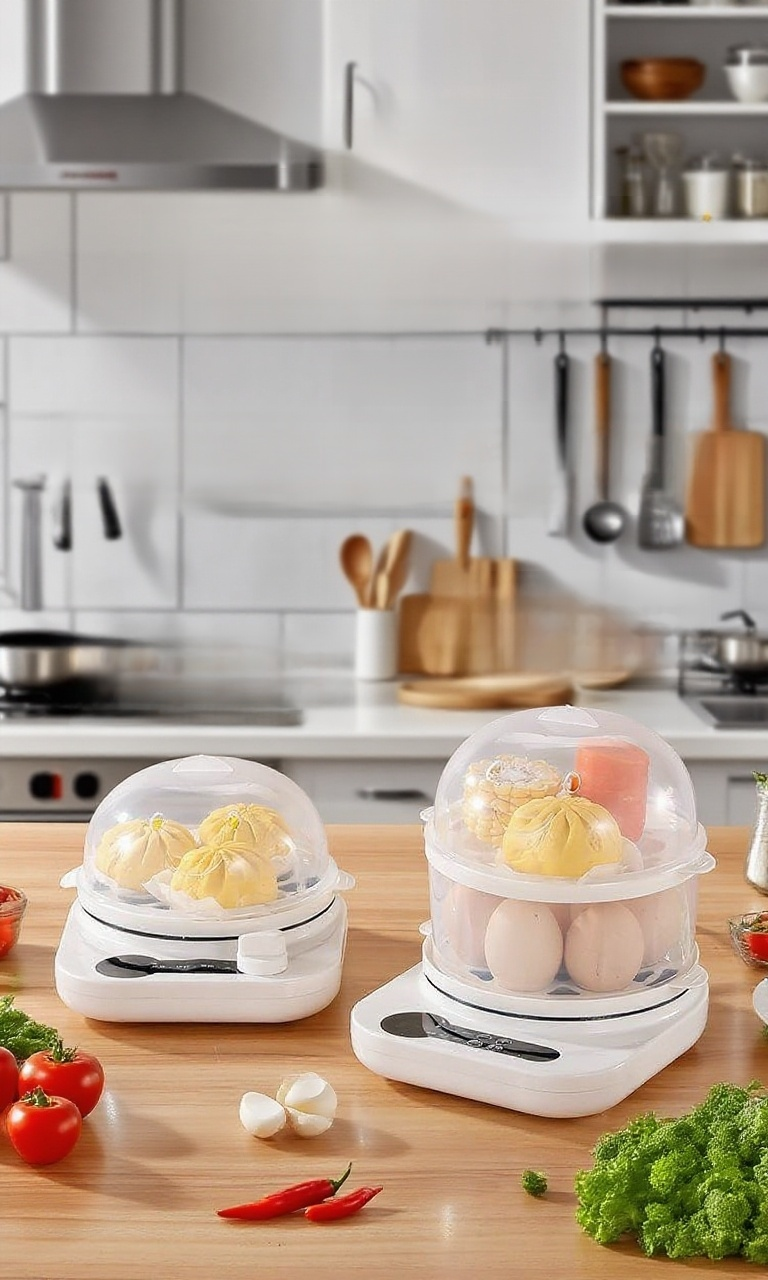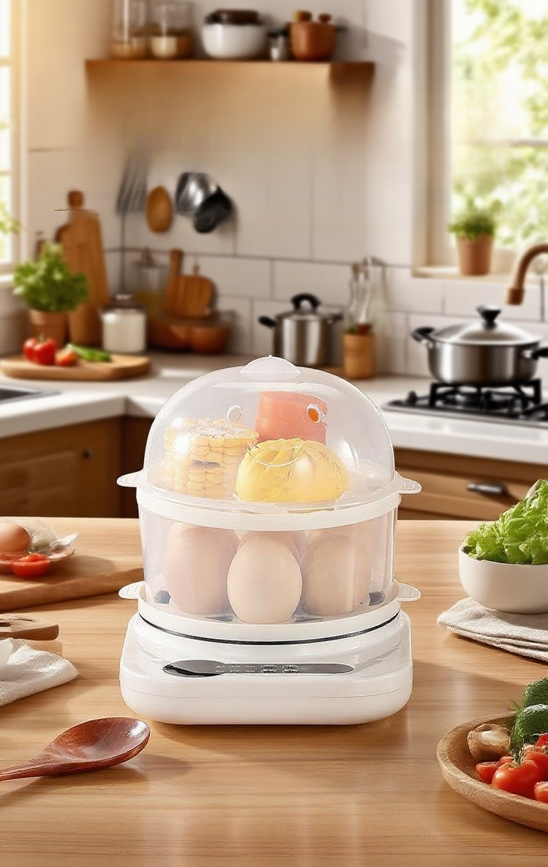 다기능 자동 전원 차단 미니 계란찜기, 안전한 자동 전원 차단, 한 번에 빠른 찜, 손쉬운 세척, 공간 절약 디자인, 다양한 요리 가능.